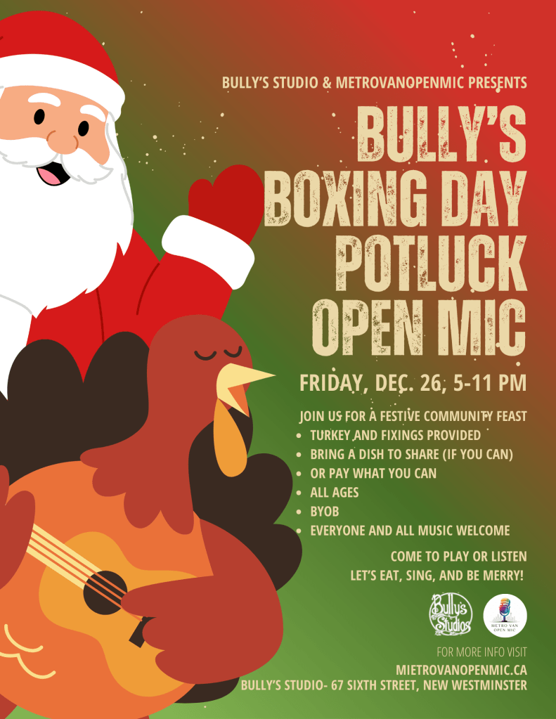 Join Bully’s Studio and MetroVanOpenMic for a festive community feast to celebrate our amazing open mic and New West community: